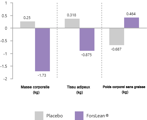 L'efficacité de ForsLean® a été confirmée dans un essai clinique en double aveugle où, après 12 semaines d'utilisation de 250 mg de ForsLean®, les sujets ont connu une diminution significative du poids corporel et de la teneur en graisse et une augmentation significative de la masse corporelle maigre par rapport au groupe placebo.